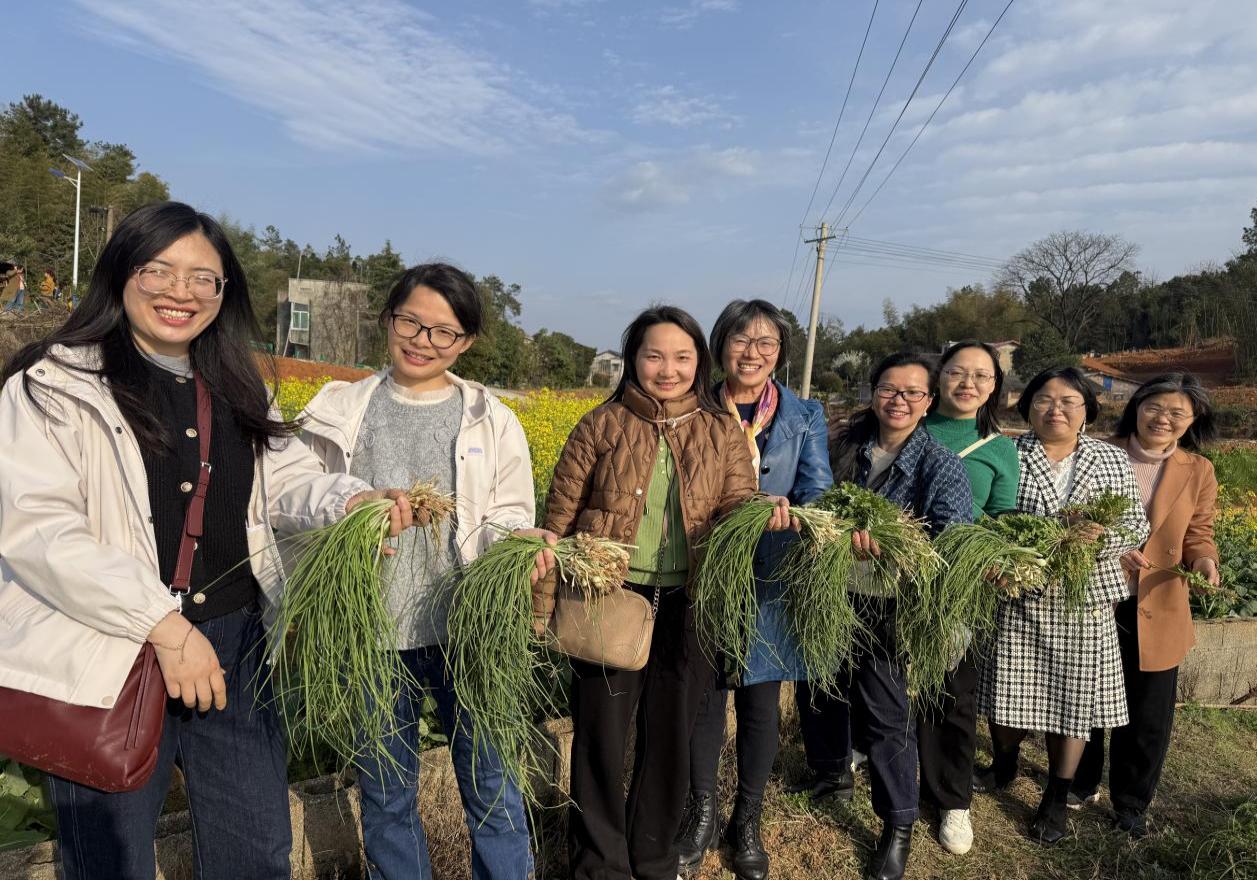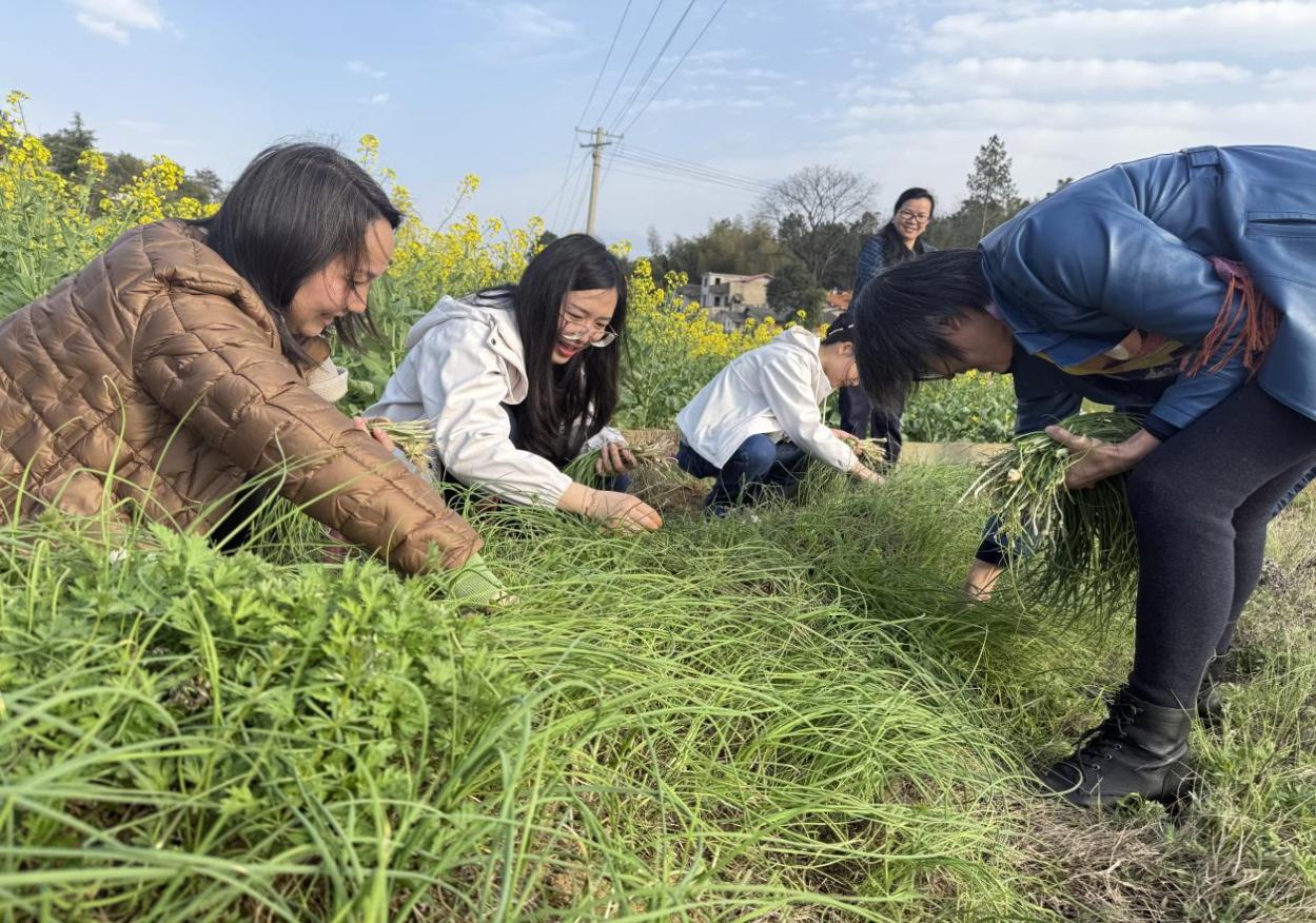 参观结束后,活动转入乡间田野。女老师们开展“春日寻鲜”农耕体验。荠菜的锯齿叶、野葱的细长茎成为辨识焦点,大家俯身协作,时而为发现一丛鲜嫩野葱欢呼,时而因误认杂草引发笑语。院党委副书记范军豪表示:“拔野菜不仅是劳动教育,更让团队在协作中增进默契,这正是‘凝聚奋进力量’的生动实践。”