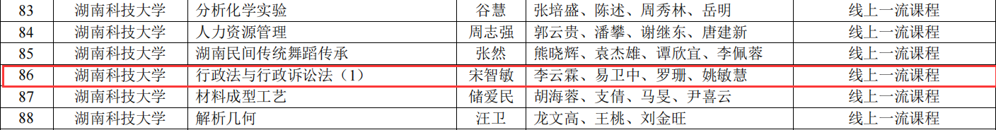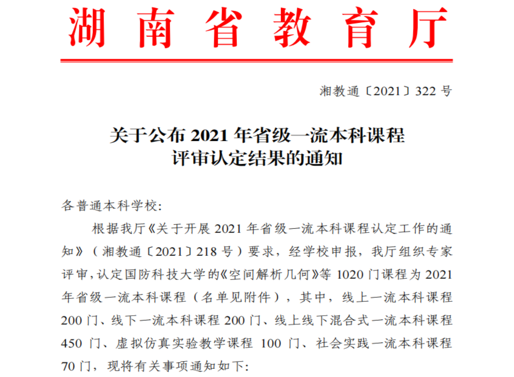 本次共认定 1020门课程为湖南省一流本科课程。其中,线上一流课程200门,虚拟仿真实验教学一流课程100门,线下一流课程 200 门,线上线下混合式一流课程450门,社会实践一流课程 70 门。湖南科技大学共有44门课程入选“省级一流本科课程”。