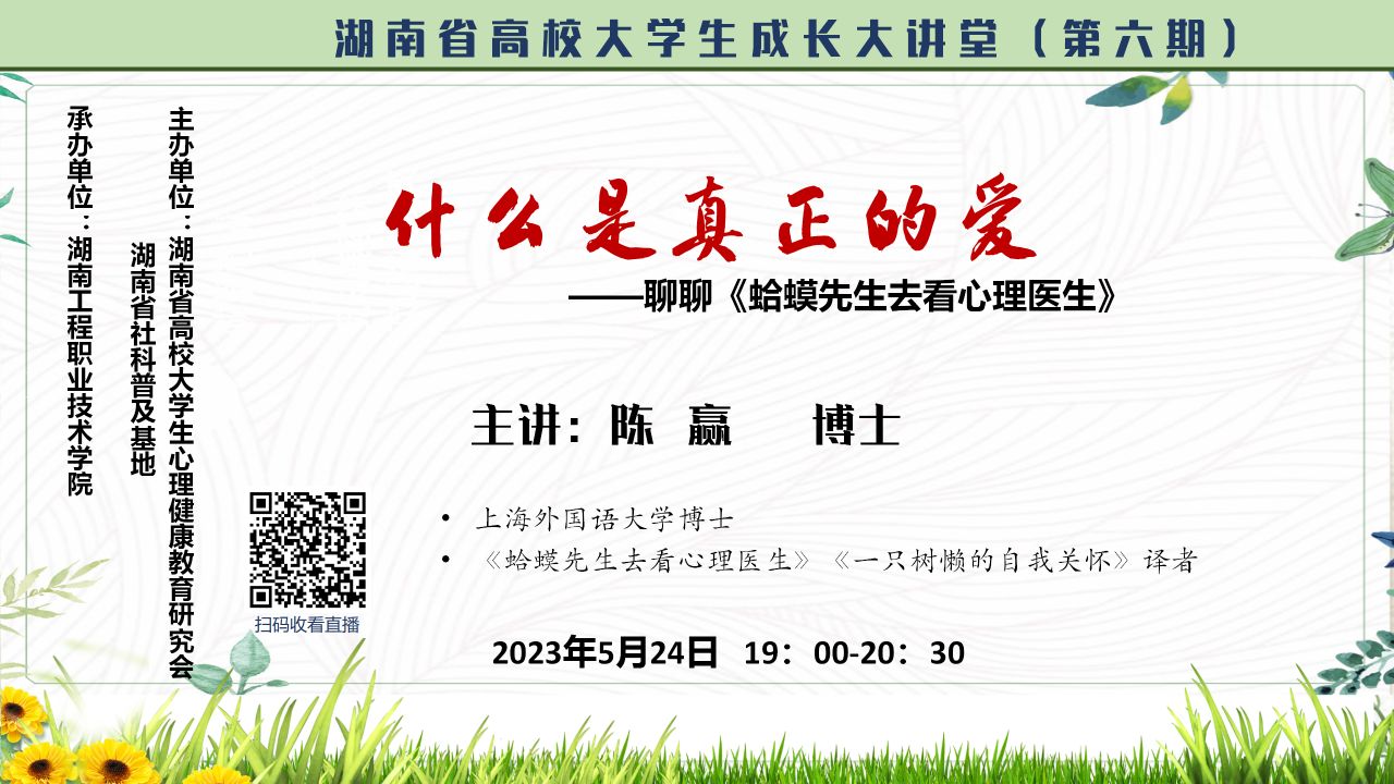 为了进一步做好大学生心理健康宣传普及教育,引导大学生勇敢探索自己的内心世界,我校特此组织全体大二学生于5月24日晚,观看“什么是真正的爱”为主题的线上直播讲座,本次讲座由《蛤蟆先生去看心理医生》的中文译者陈赢博士主讲。金沙威尼斯欢乐娱人城积极响应学校号召,组织学生观看讲座,学习知识,并取得良好反响。
