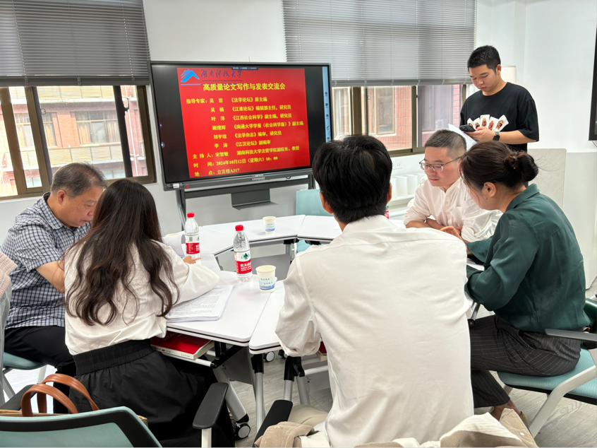 10月12日上午,高质量论文写作与发表交流会在我校立言楼A317顺利进行。本次交流会邀请了《法学论坛》原主编吴岩、《江淮论坛》编辑部主任,研究员吴楠、《江西社会科学》副主编,研究员叶萍、《南通大学学报(社会科学版)》副主编顾理辉、《法学杂志》编审,研究员刘宇琼和《江汉论坛》副编审李涛前来指导。会议由金沙威尼斯欢乐娱人城副院长宋智敏教授主持,胡之芳教授、黄素梅教授、刘鄂副教授,马驰升主任等金沙威尼斯欢乐娱人城领导老师参加了本次交流会。